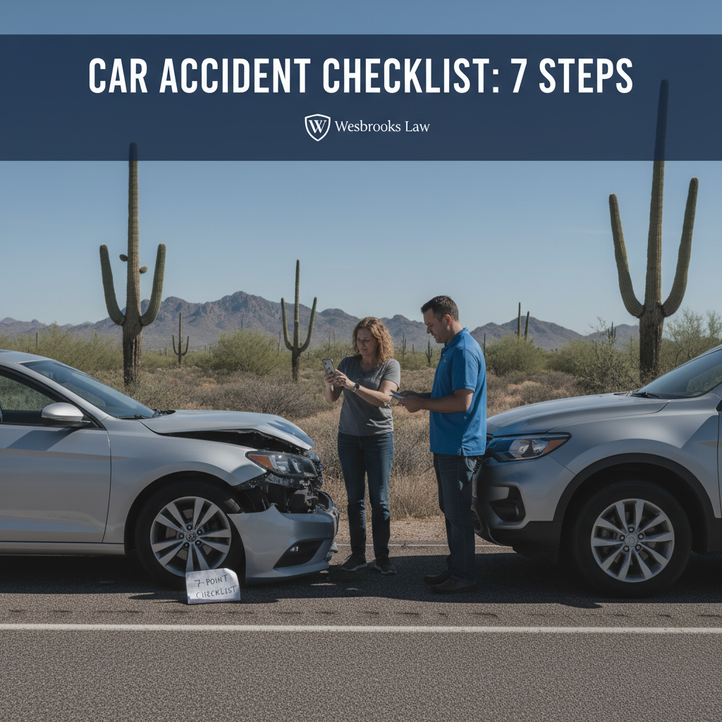 At Wesbrooks Law, we understand how critical these first moments are. To help you navigate this difficult situation, we’ve created the ultimate checklist of seven things you should do immediately after a car accident in Arizona.